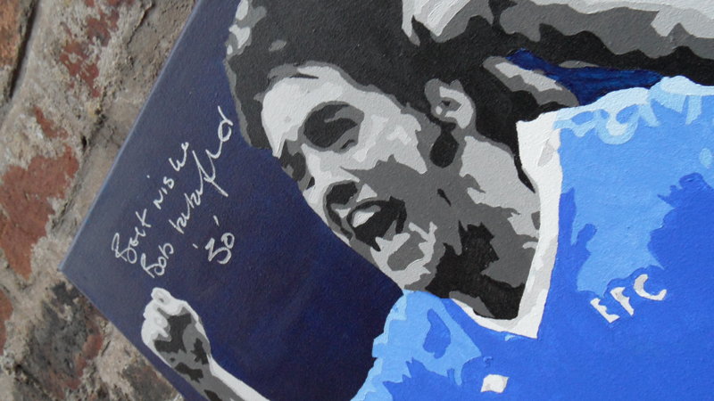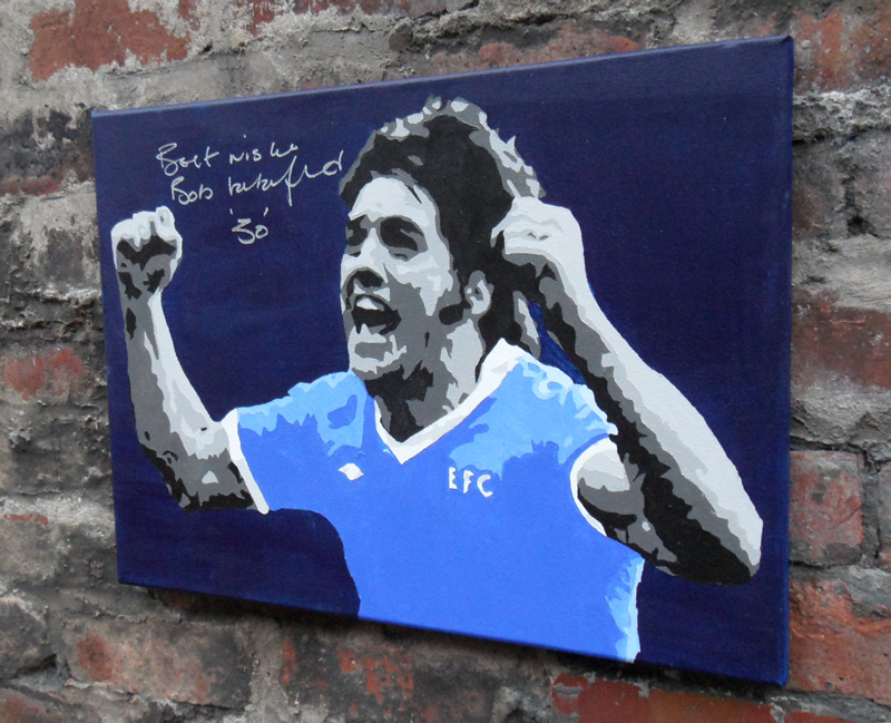 Hand signed by Everton’s legendary goal goalscorer Bob Latchford. This hand painted canvas was signed byย Bob himself at one of our arranged signing sessions. The painting shows Bob celebrating ‘that’ unforgettable 30th goal against Chelsea at Goodison in May 1978. Bob has signed the canvas with a ’30’ in the top corner under his signature.