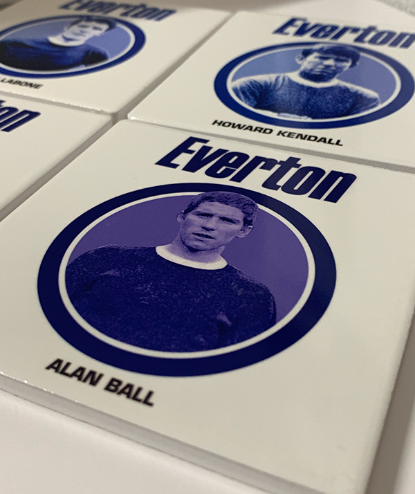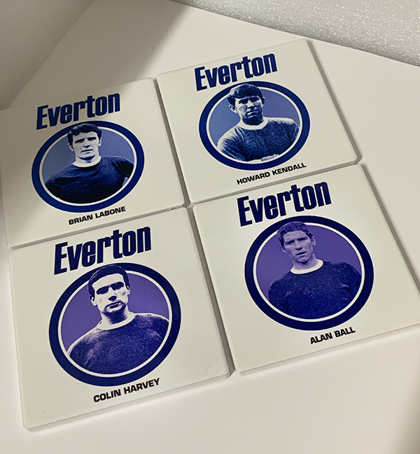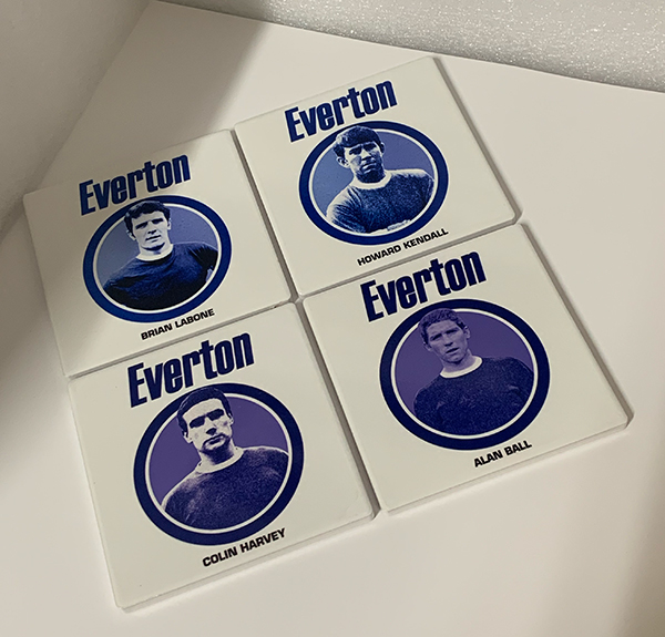 This lovely set of four ceramic coasters feature the legendary ‘Holy Trinity’ of Alan Ball, Howard Kendall and Colin Harvey as well as captain Brian Labone from Everton’s 1970 Championship winning team.