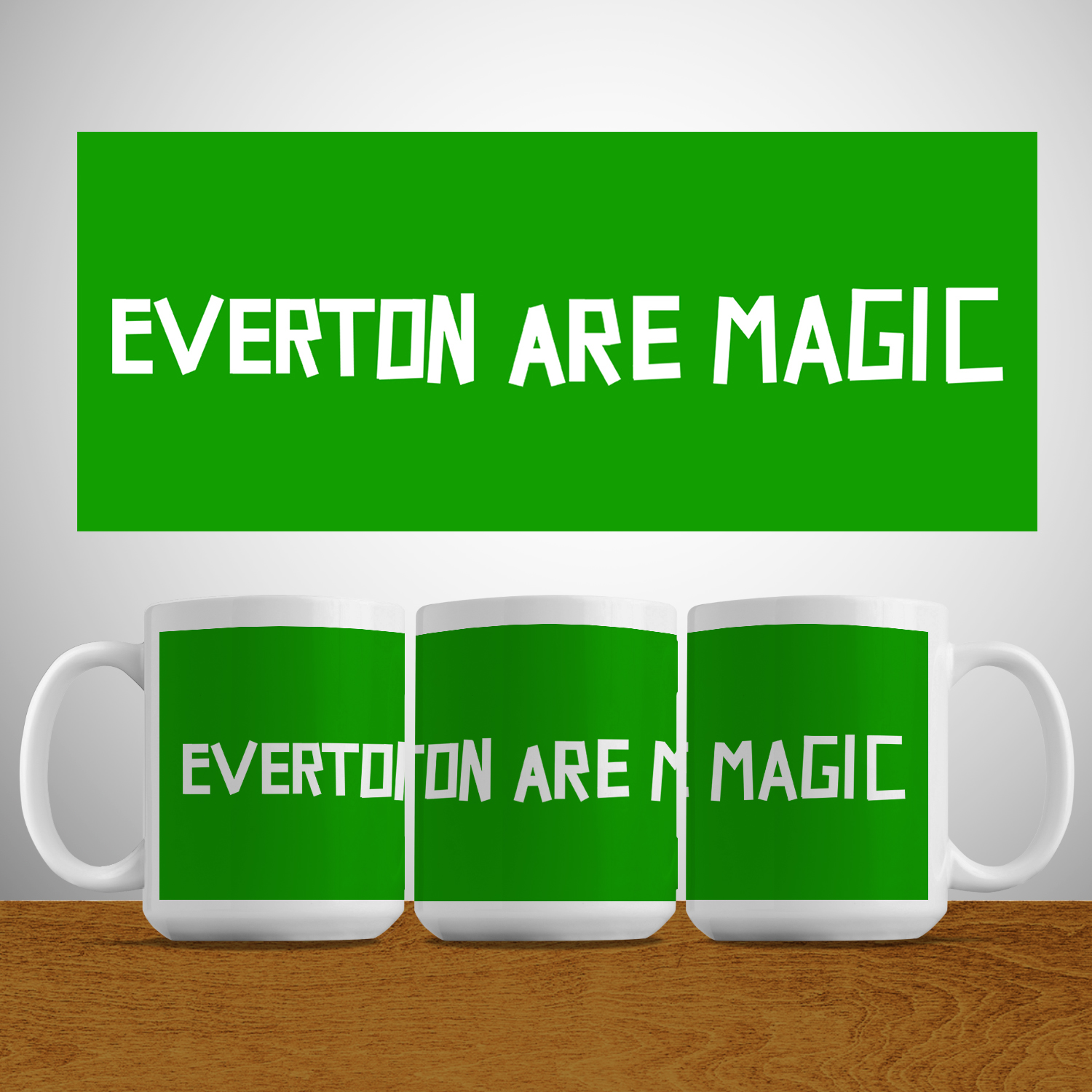 Everton Are Magic 15oz MEGA mug based on the famous green flag in the Gwladys Street terrace in the late 60s. Available in traditional Everton blue or green – the original colour of the infamous flag.