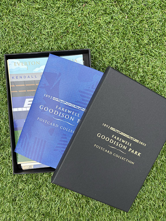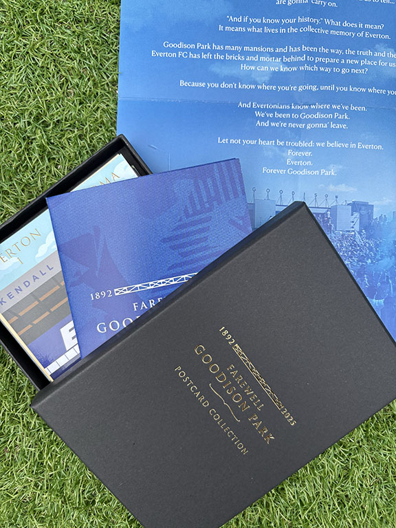 The presentation box is a gold foil branded rigid presentation gift box and comes with a fold-out A4 poster featuring renowned local photographer John Johnson’s image and words from Evertonian singer/songwriter Alan O’Hare.