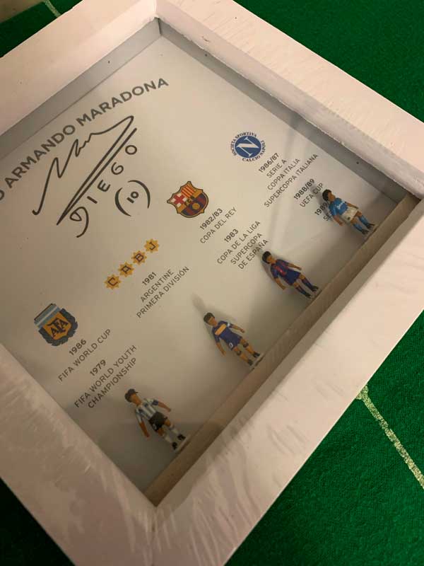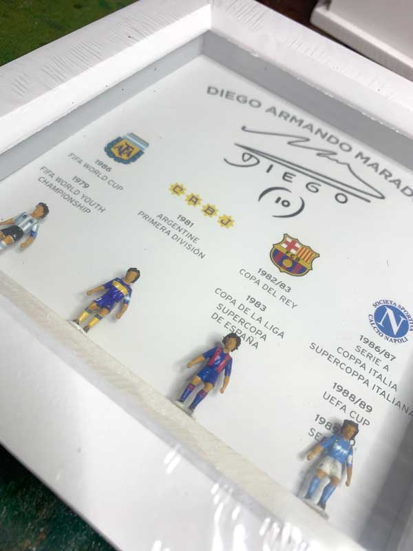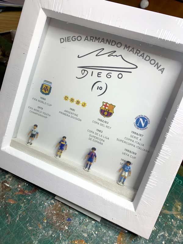 Presentedย in a 15cm square deep box box frame, these Subbuteo inspired Maradona figures celebrate arguably the world’s most loved football player.