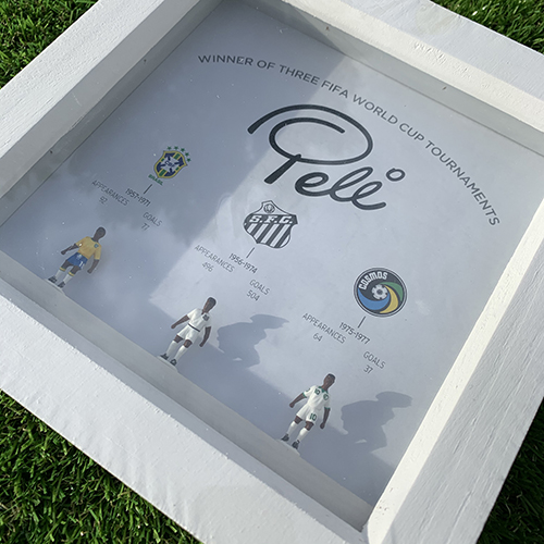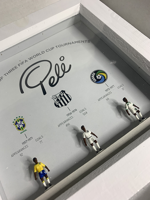 Known to many as the the greatestย everย footballerย Brazilian Pele is celebrated here in a lovely handcrafted Subbuteo set featuring his career with the three teams he played for – Brazil, Santos and New York Cosmos.ย