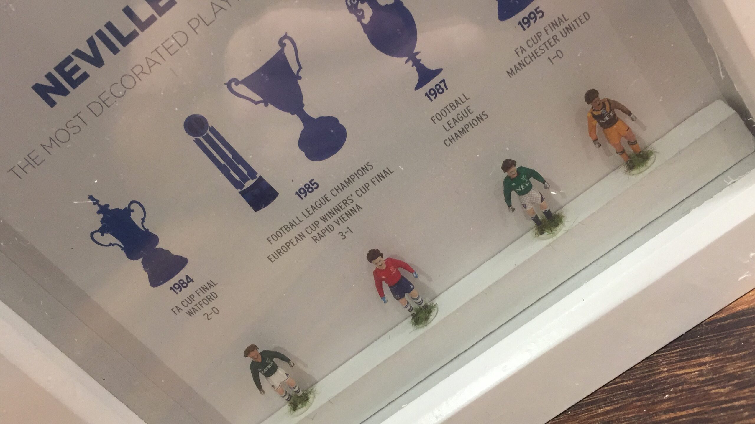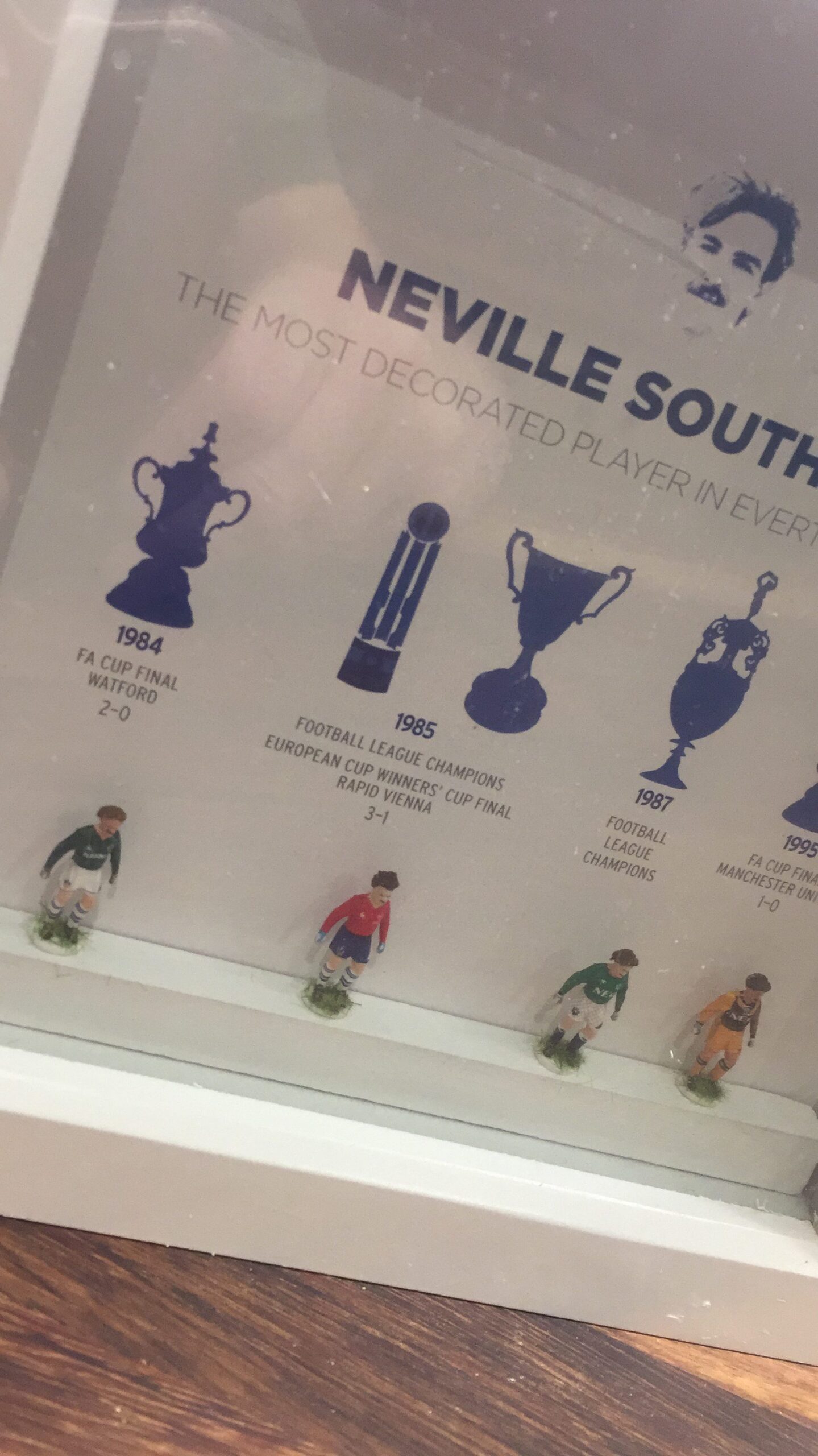 Hand painted and decaledย on a modernย Subbuteo figure. Fine detail such as sponsors, badges and kit detail are all here including numbers. There is a very limited amount of these signed by Neville himself.