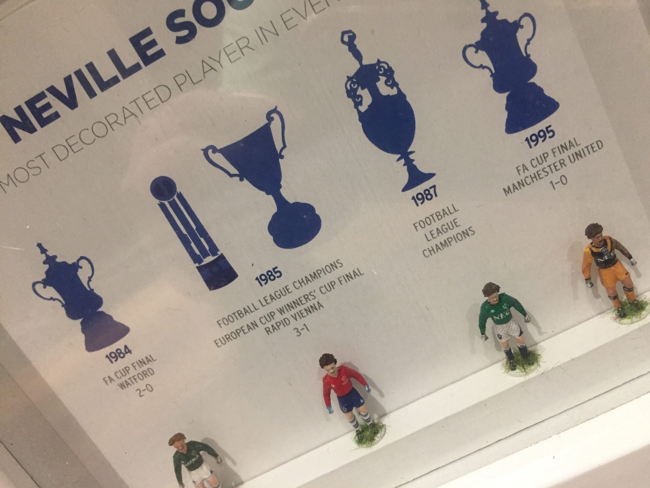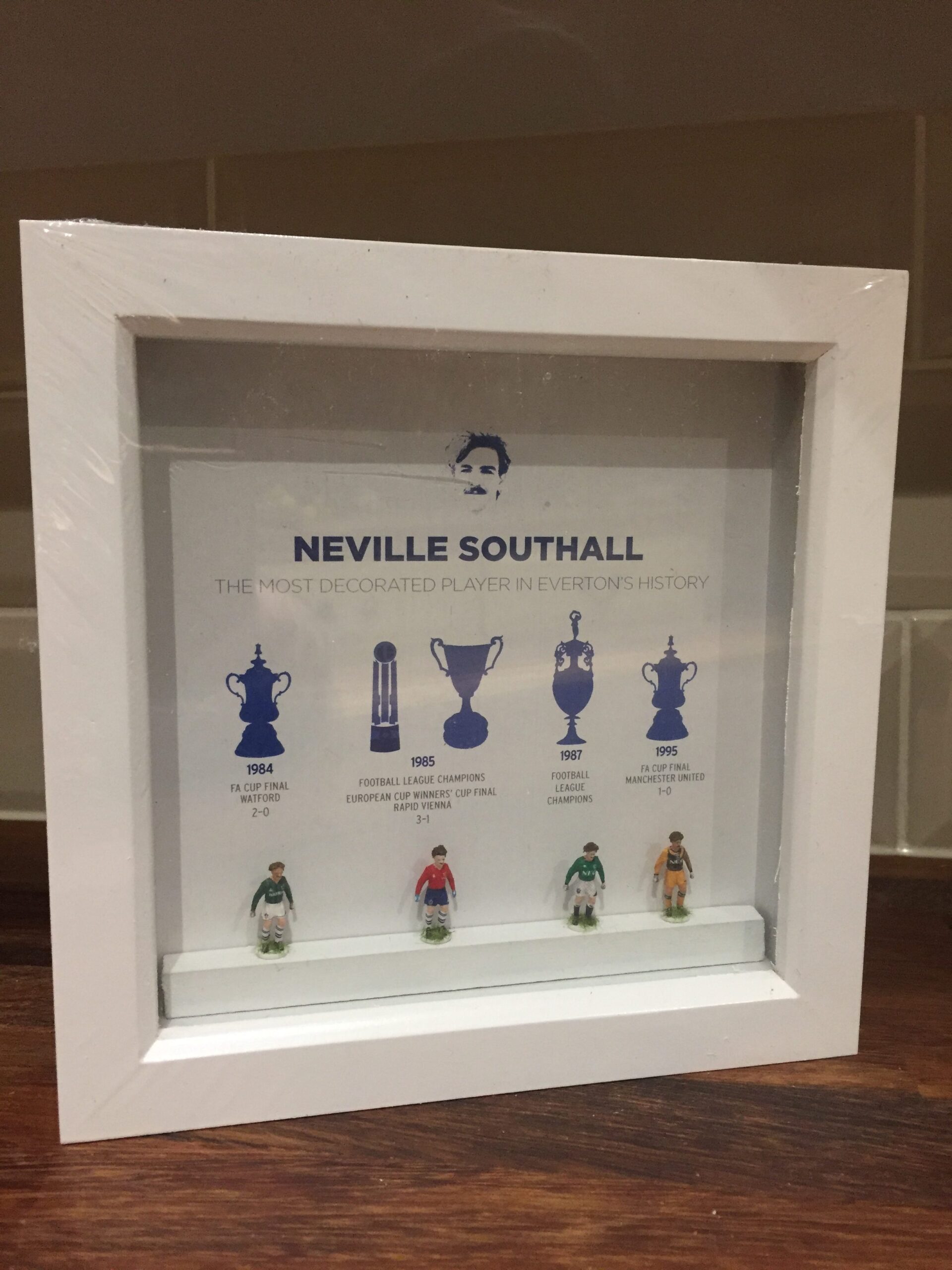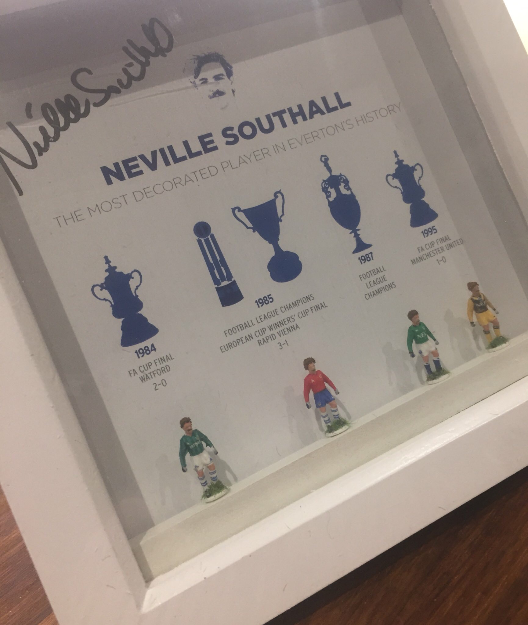 Presented in a 15cm x 15cm deep box frame each player is painstakingly painted by hand with more modern teams’ finer detailed elements of the kits decaled. Celebrating Neville Southall, Everton’s ‘most decorated’ this item is one for theย collectors.